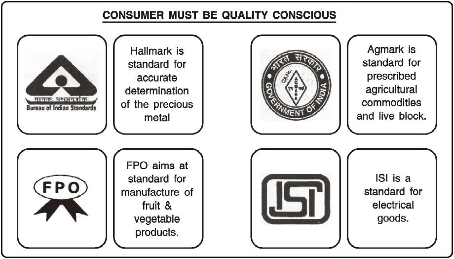 - उपभोक्ता को गुणवत्ता जागरूक होना चाहिए:- उपभोक्ता को केवल मानक वस्तुएँ ही खरीदनी चाहिए जैसे बिजली के उपकरण पर आईएसआई चिन्ह, खाद्य उत्पादों पर एफपीओ तथा गहनों पर हालमार्क का चिन्ह आदि देखकर ही खरीदना चाहिए। यानि की उसे वस्तु की गुणवत्ता के संबंध में सदैव जागरूक रहना चाहिए।